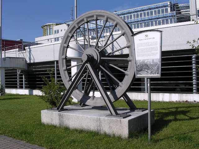 eine Seilscheibe und ein Hinweisschild auf die Schachtanlage Heinrich Gustav.