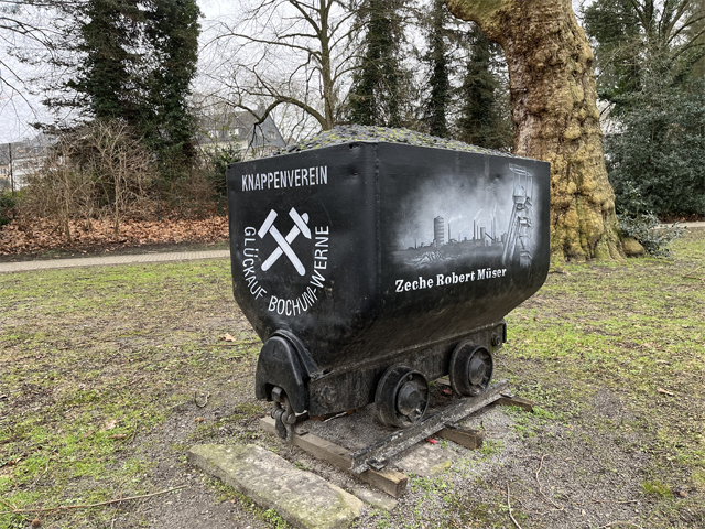 Selbst unsere Parkanlage wird durch einen restaurierten Kohlenwagen geziert. Im bizarren Sonnenlicht erscheint